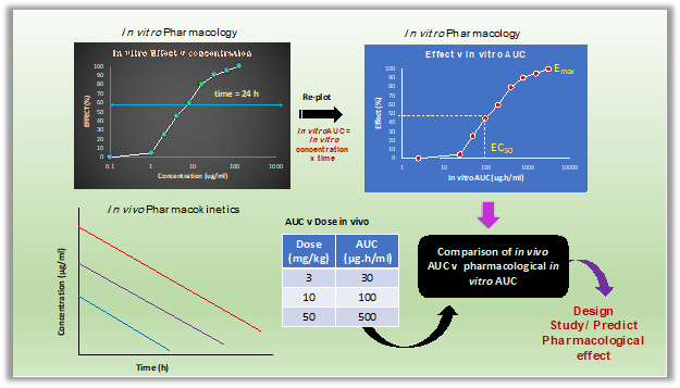 Thus, if there are 8 concentrations in the assay for which the effect is determined, there will be eight in vitro AUCs associated with effect.  One can then estimate the in vitro AUC associated with Emax and EC50. Based in the in vitro AUC, it is possible to predict pharmacological exposures (AUC in vivo) required to achieve a specific magnitude of effect in vivo, assuming there is a correlation between in vitro and in vivo pharmacological effect.  The estimation of in vitro AUC assumes that the concentration of candidate drug in the assay does not change significantly in the time period (inhibition or activation assays with cells expressing the target).